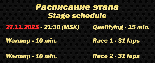 1) Как всегда, следите за объявлениями!2) Как ввести имя и фамилию в игре.3) В мод добавлены составы резины сезона 2022! Их названия заканчиваются на 22. Сравните с современными. Ехать гонку можно будет на любой резине.Историческая справкаЧетыре правых поворота и два левых - в принципе это всё, что нужно знать о трассе. Сезон 2013 запомнился вылетом, при переключении с вармапа на гонку, Алексея Алисова, который должен был стартовать со 2й позиции, и рестарта не дали. Да, вот такие были суровые времена. В итоге Алексей пропустил первую гонку, а во второй выиграл с 9 места. В сезоне 2016 отметился Александр Алейников большим шлемом в первой гонке, а также команда Draft Legion, забравшая весь подиум в обеих гонках. Сезоны 2018 и 2020 подтвердили, что поул здесь гарантирует как минимум одну победу. Только в 2022 году это правило было нарушено, но уже в сезоне 2024 всё вернулось в норму. ;Biggrin