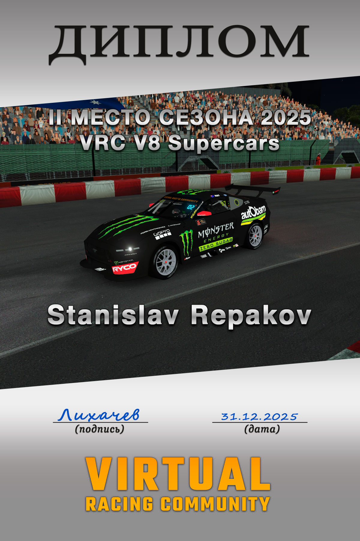 Диплом за второе место VRC V8 Supercars 2024 вручается Станиславу Репакову!